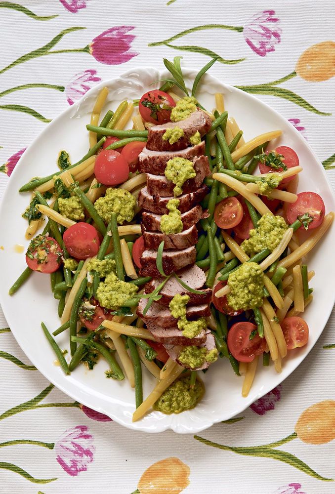 Fläskfilé med dragonkryddad bön- och tomatröra och avokadocrème