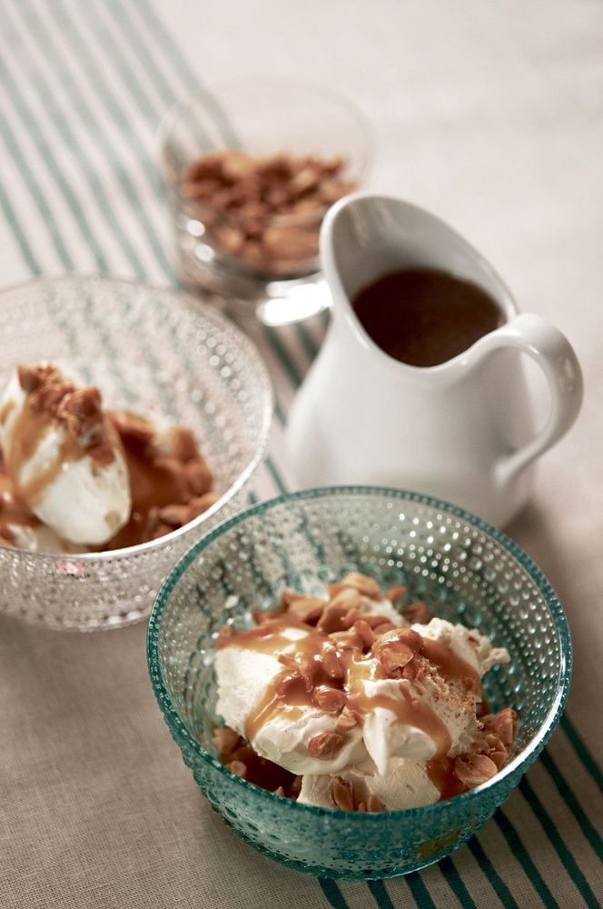 2. Lägg upp glass i skålar eller på tallrikar, ringla över generöst med kolasås och toppa med nötter.
