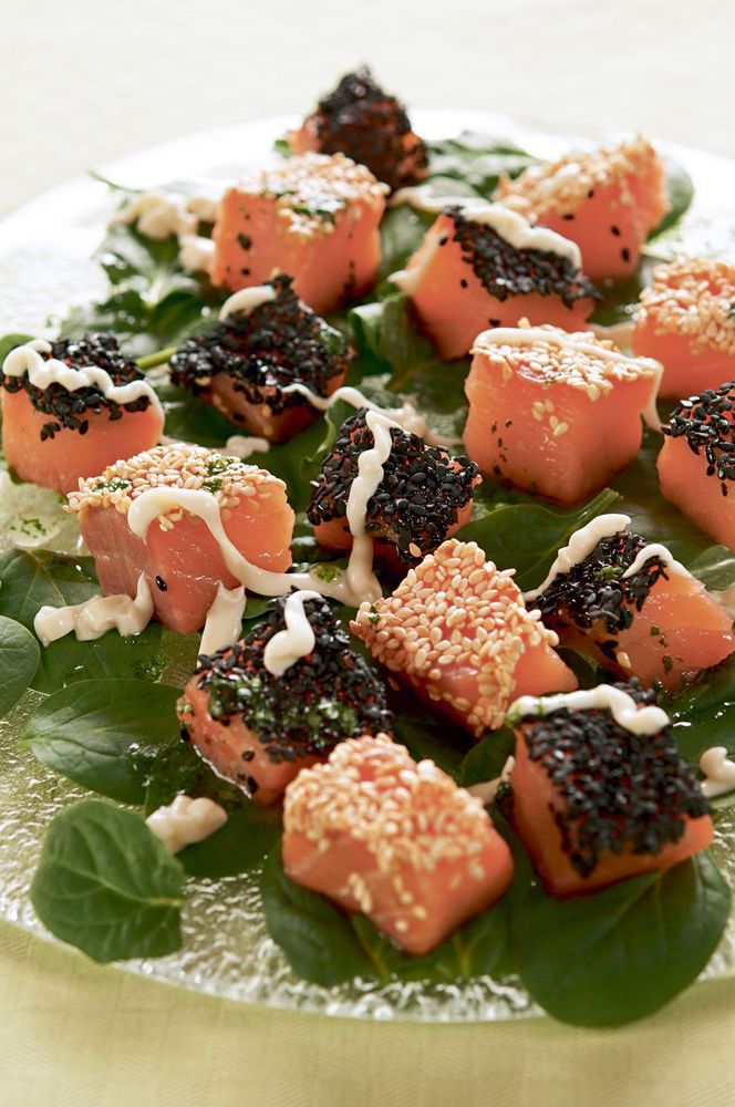 6. Servering: Skrapa och torka bort gravningslagen från laxen, befria filén från skinnet. Skär laxen i snygga tärningar, cirka 2 × 2 × 2 cm. Doppa hälften i ljusa sesamfrön, hälften i svarta.