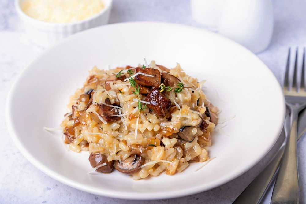 "Risottogrunden kan du göra i god tid i förväg, redan samma morgon. Se till att kyla ner riset snabbt genom att hälla ut det på en plåt eller en stor flat tallrik och låt svalna i rumstemperatur. Ta sedan fram risottogrunden, koka upp den och färdigställ risotton. Tar då max 5 till 10 minuter när gästerna är på plats."