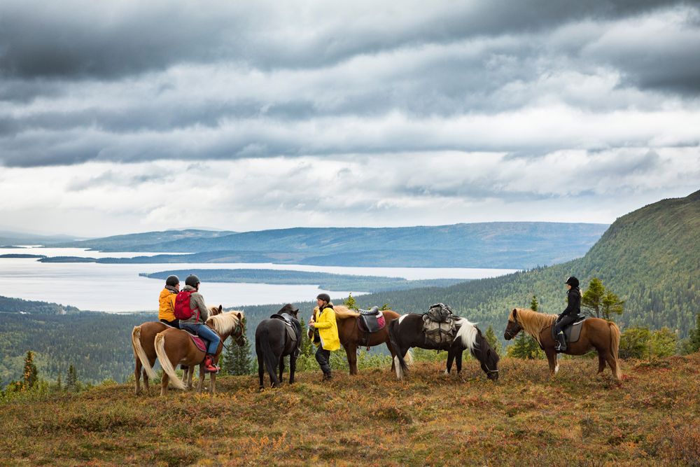 Det går ganska brant uppför och ridturen går i sakta mak mitt i en fjällvärld som precis börjat glöda som guld. Långt därnere glimmar Lill-Jorm och Stor-Jorms vatten och på marken går det fortfarande att spana ett och annat hjortron. Här är gudagott att vara!