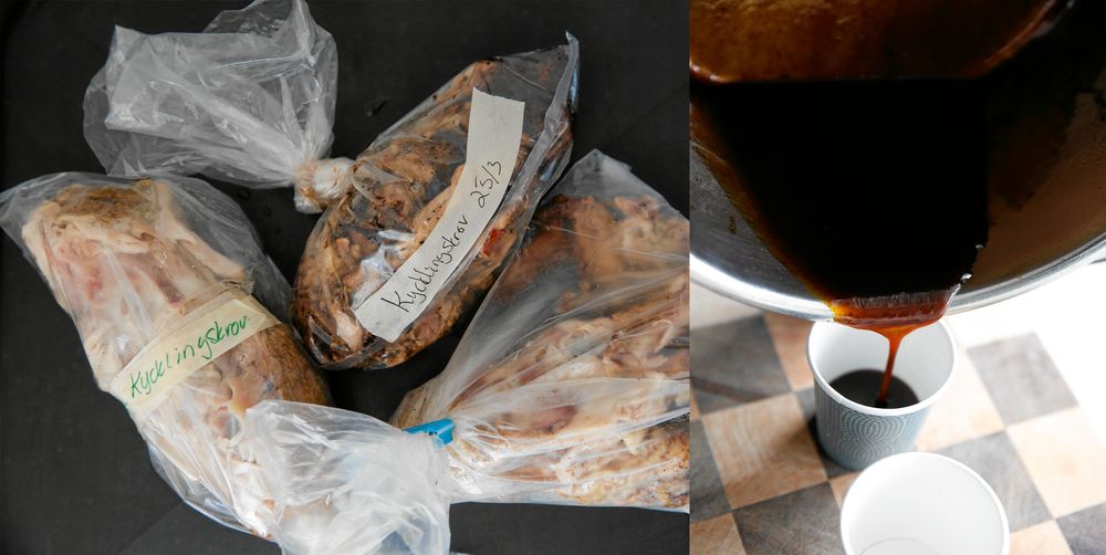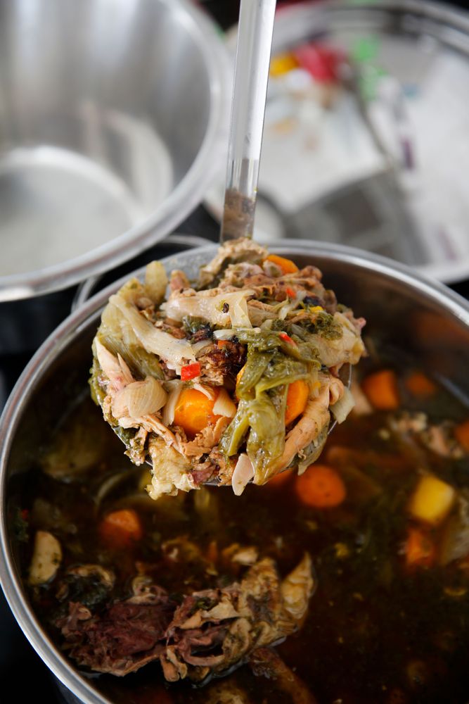 Efter 3-4 timmar lyfter du upp kycklingrester och grönsaker med en hålslev.
