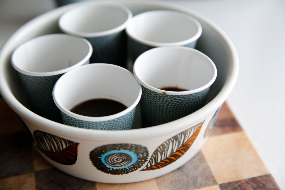 Häll upp fonden i helt vanliga pappmuggar, bättre än till exempel bakformar och iskuber. Sätt pappmuggarna i en större form (för att de inte ska välta) och sätt i frysen.