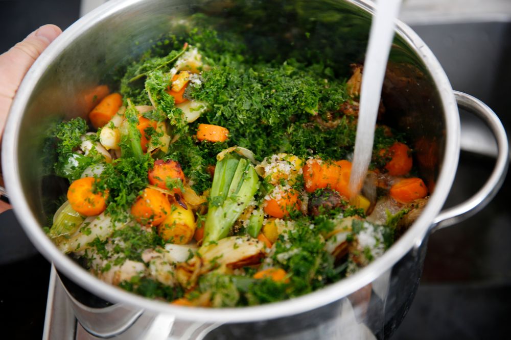 Häll över grönsakerna i en stor gryta med kryddor och kycklingskrov. Fyll upp med vatten så att alla ingredienser hamnar under vattenlinjen. Låt sedan småputtra på spisen under åtminstone 3-4 timmar. Gärna längre. Om kycklingen är rå kommer det att skumma en del. Använd i så fall en helt vanlig sked och skumma av efterhand som resterna kokar.