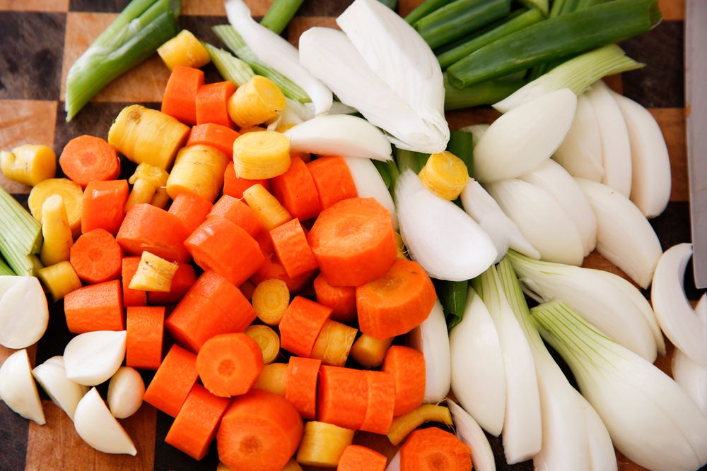 Skölj (och eventuellt skala) morötter och lök. På sommaren funkar det fint att använda skalet som ännu inte blivit hårt och skyddande. Dela grönsakerna i mindre bitar och tärna ner lökblasten i buljongen. Hacka bladselleri och persilja.