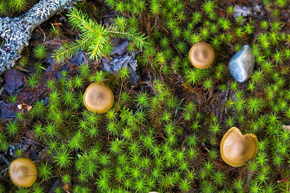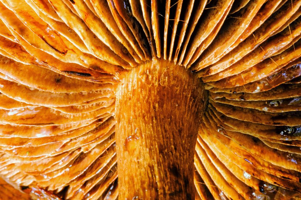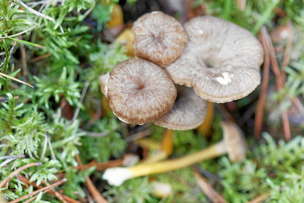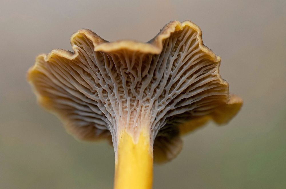 Trattkantarell: Grenade åsar som går ner en bit på foten. Först är de gula gula, sedan grå.