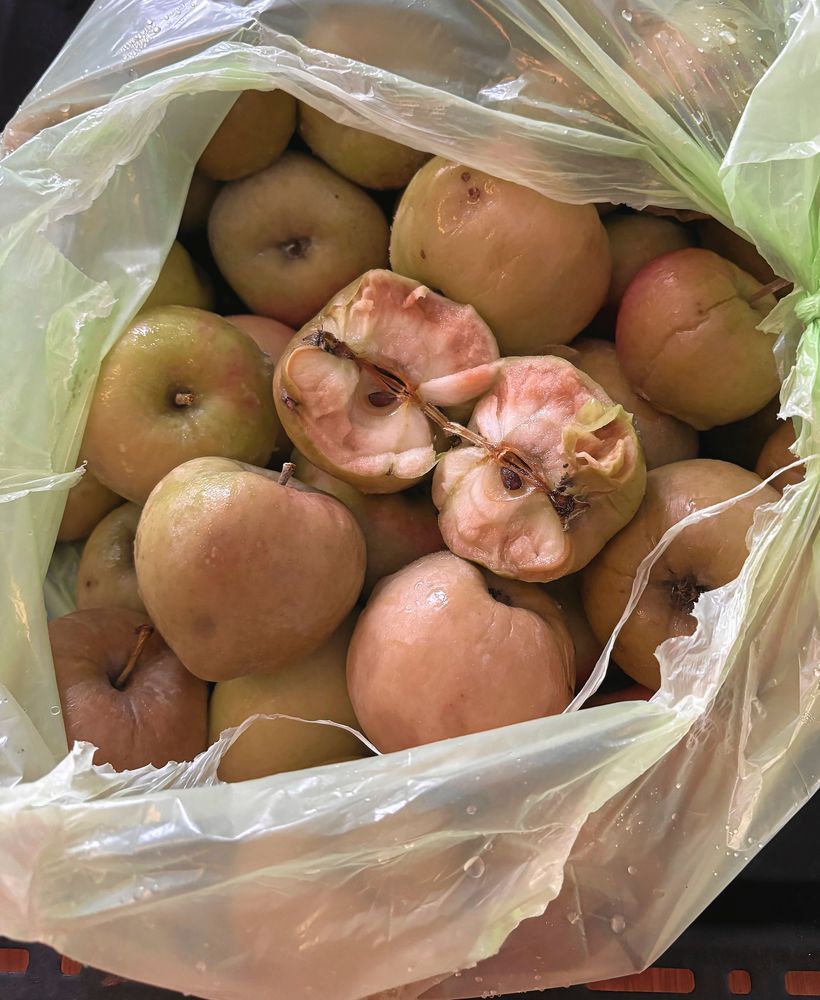 Lägg äpplena i frysen och låt dem frysa till krocketklot. Ta sedan fram dem och låt dem tina. Redan då börjar musten läcka ur frukten så lägg dem på exempelvis en långpanna som fångar upp.