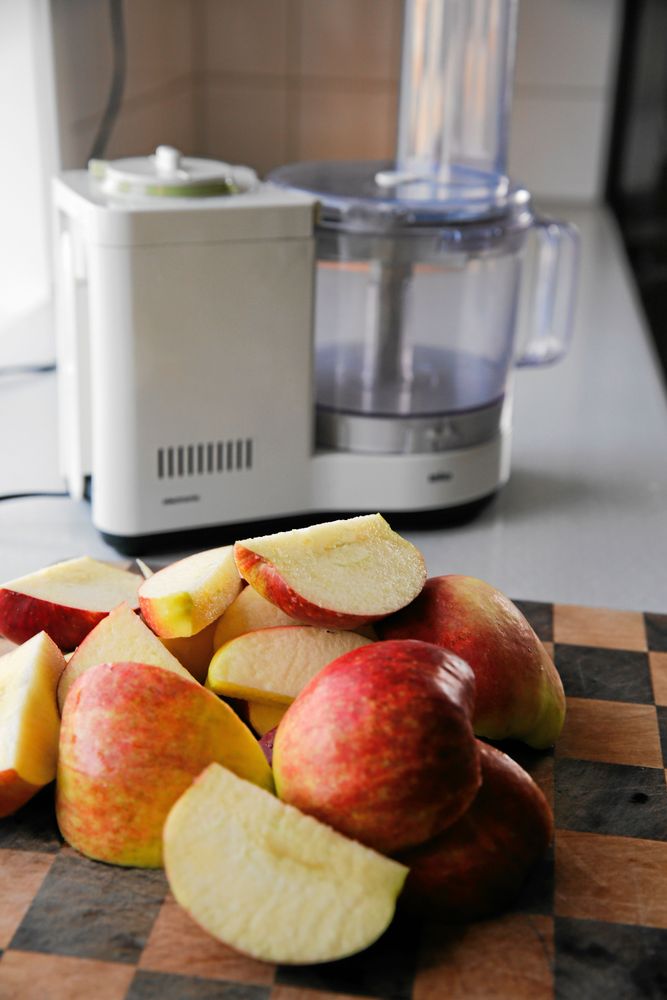 Många gör äppelcidervinäger på äpple som skurits i bitar, men det går även bra med äppelriv. Då river du de delade äpplena i matberedaren.