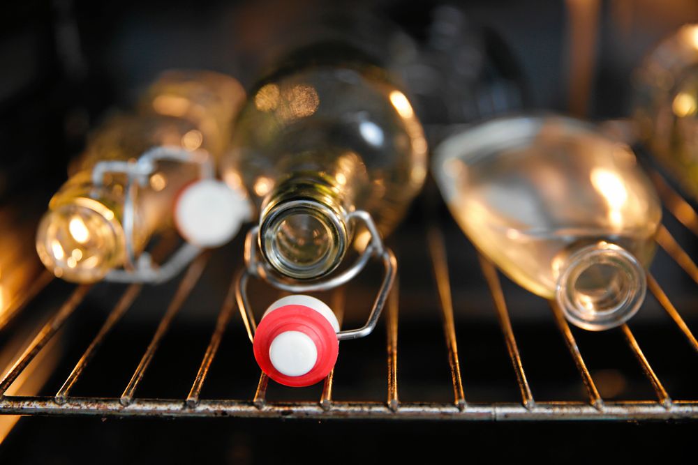 Desinfektera glasflaskor genom att låta dem ligga i ugnen i 100 grader i åtminstone 30 minuter.