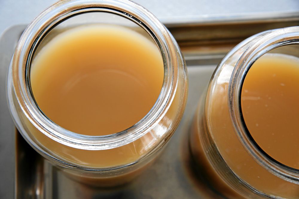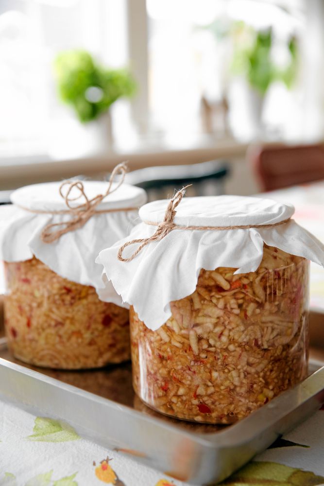 Ställ burkarna varmt, en glasveranda eller intill en vedspis är perfekt. Sätt gärna ett fat under burkarna för att förhindra fläckar när äppelcidervinägern jäser och rinner över kanterna. Rör om ordentligt en gång i veckan under 3-4 veckor.