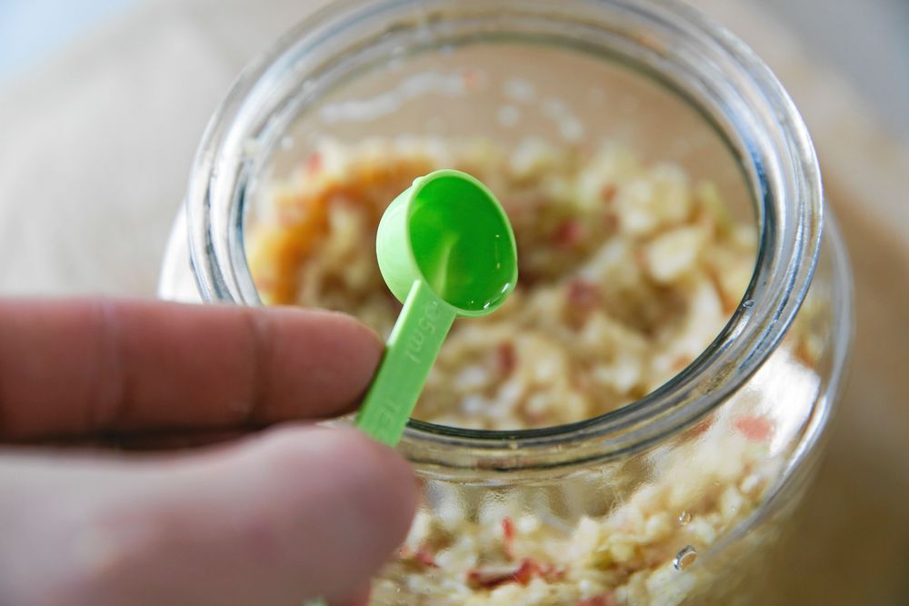 Tillsätt ett par teskedar äppelcidervinäger, köpt eller från egen tidigare tillverkning. På så vis ger du vinägerutvecklingen en knuff framåt. Fortsätt sedan att fylla upp burkarna med äppelriv och pressa hela tiden med knytnäven så att det bildas mycket vätska. Fyll därefter upp med kallt vatten ända upp till kanten.