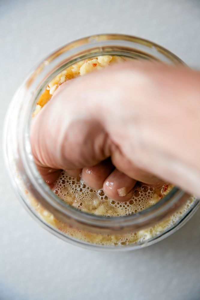 Ta äppelrivet direkt med handen ur matberedaren och packa rivet hårt i en glasburk eller större kruka. Tryck med handen, med en grov träbit eller en surkålsstamp.