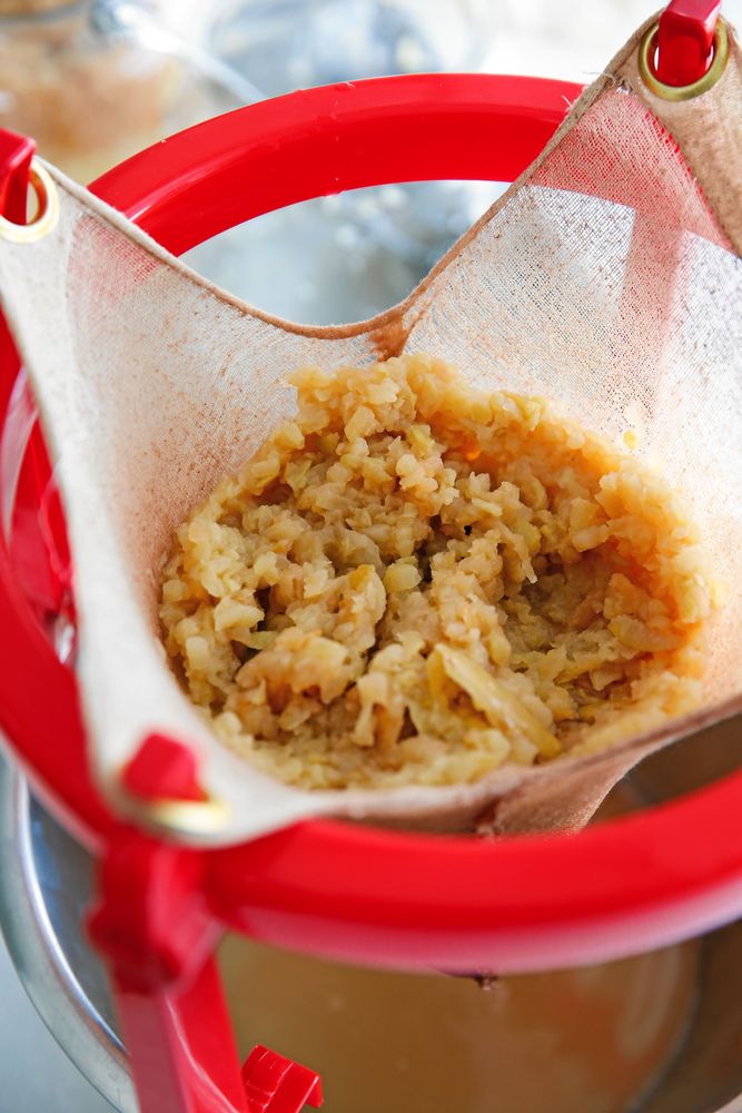 Efter fyra veckor är det dags att sila bort äppelrivet. Använd en saftsil med duk eller en annan avrinningsanordning. Se till att pressa ur all vätska genom att pressa duken ordentligt. Använd gärna händerna. Du kan också låta äppelrivet droppa under 1-2 dygn i en saftsil.