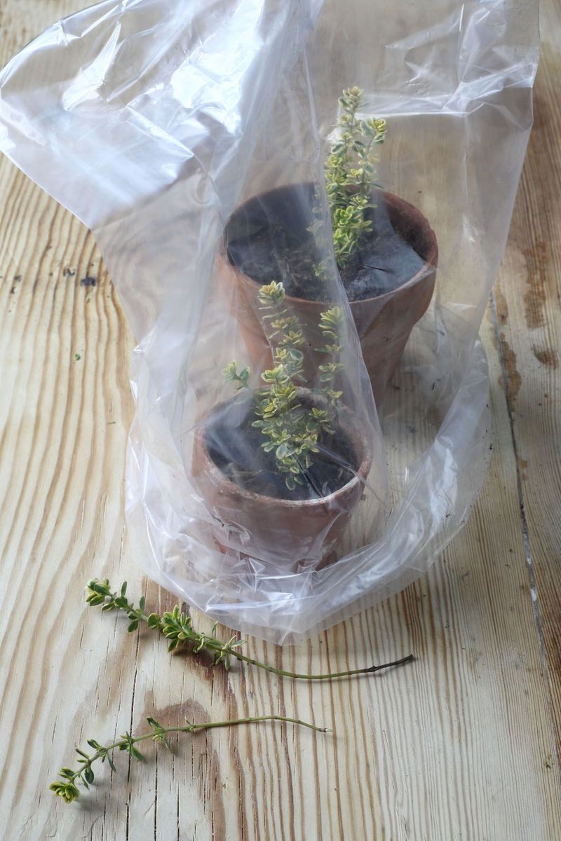 Stora mängder kräver många plantor och citrontiomjan kan inte sås utan förökas med stickling. Jag skattar plantorna på kvistar, drar av de nedersta bladen och sticker ner i jord. Inget finlir annat än att jorden ska hållas fuktig. Eftersom jag ibland glömmer att vattna brukar jag gardera med en plastpåse över krukan för att behålla fukten. Efter bara ett par, tre veckor har sticklingarna nya rötter och får en egen plats på lotten.