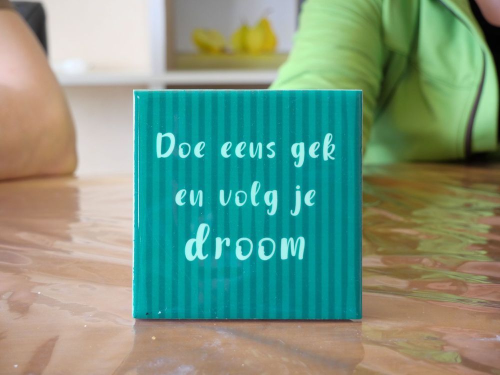 På hyllan bakom henne står en skylt med nederländsk text som de fick i flyttpresent från en av sina vänner. ”Var lite galen och följ din dröm” är den svenska översättningen.