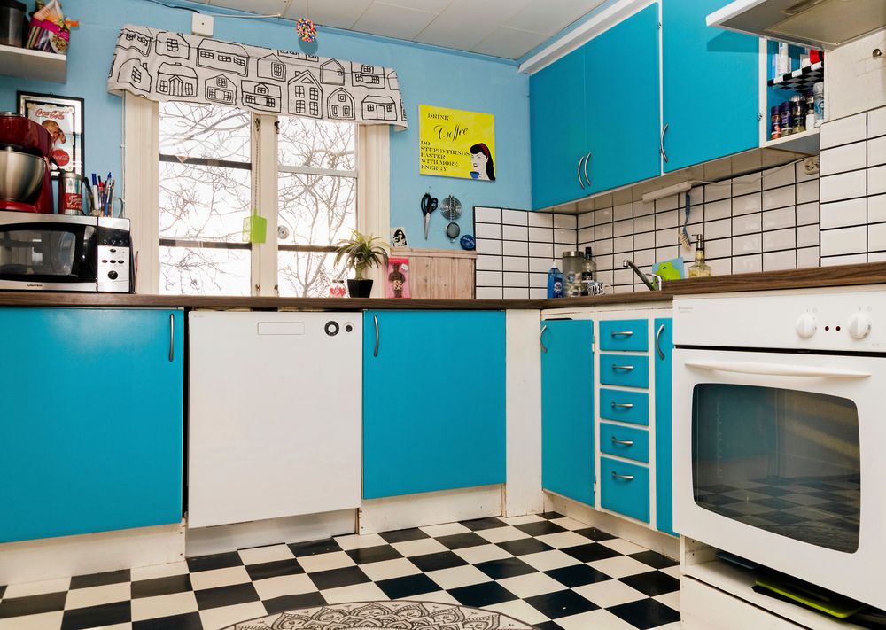 Överallt märks intresset, eller snarare passionen, för 1950-talet - i tapetval, dukar, tyger, affischer, prylar, inte minst i köket med turkosa luckor och schackrutigt golv.