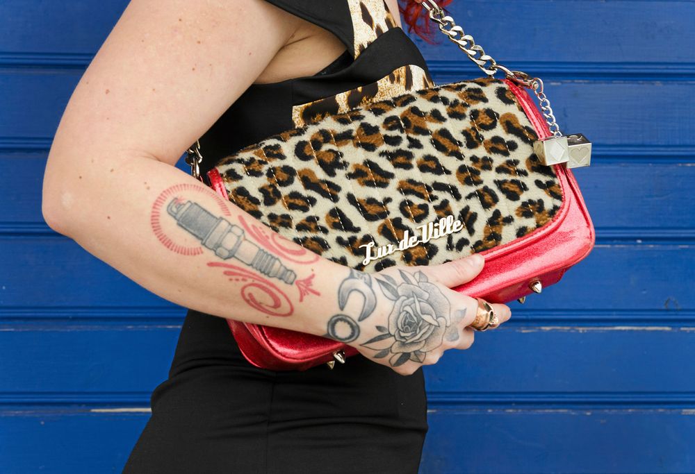 På högerarmen har hon låtit tatuera ett tändstift, och runt handleden en fast nyckel.