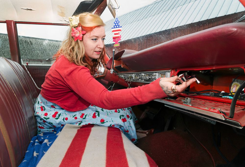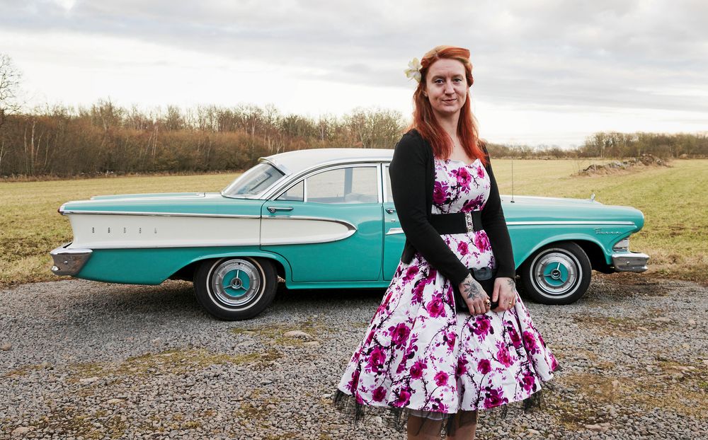 För dagen har Carolina kombinerat den blommiga klänningen med vidd i kjolen med röd kofta och röda skor, en klädsel som matchar amerikanaren, en Galaxie -64.