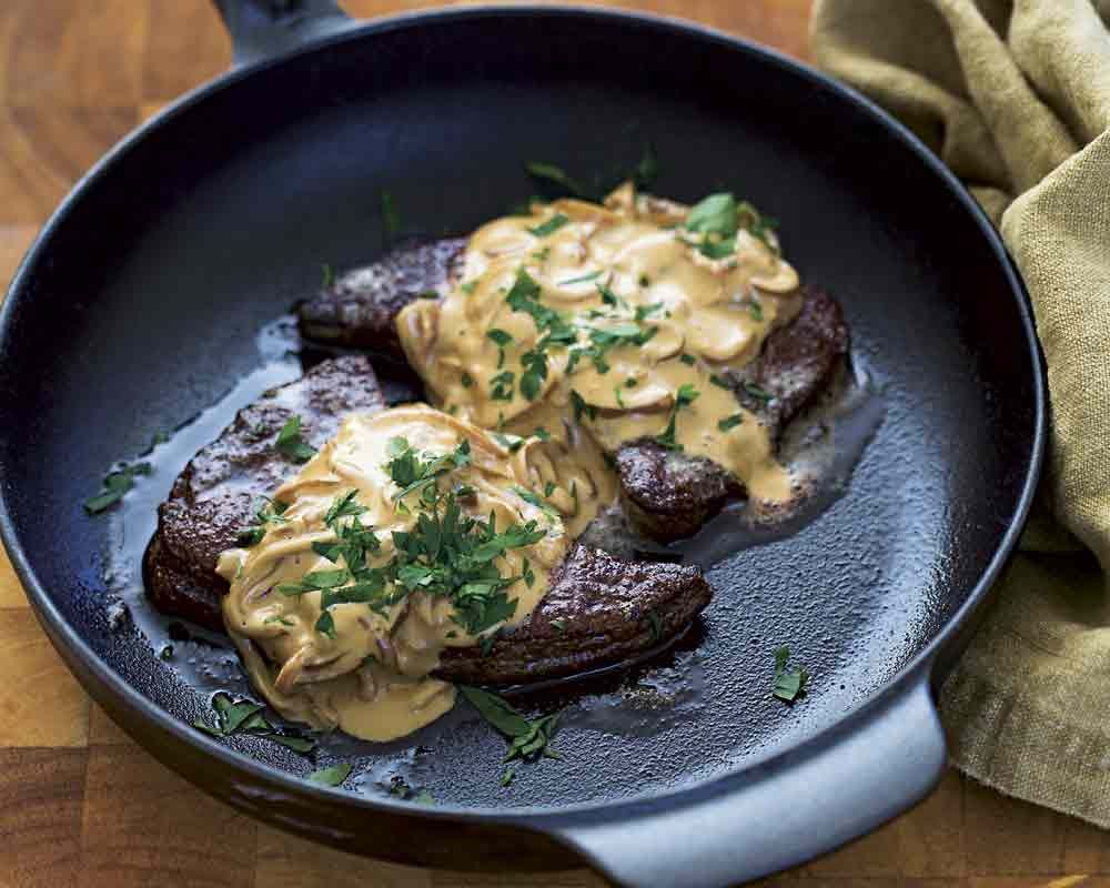 5. Häll löksåsen över leverbiffarna vid servering. Garnera med hackad persilja.