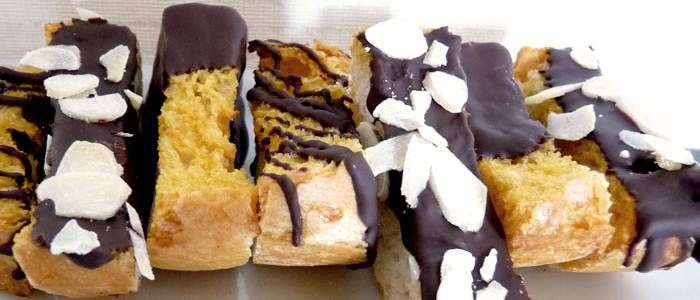 7. Doppa ena änden av skorporna, pensla dem ovanpå, eller ringla chokladen över, allt efter tycke och smak. Strö eventuellt flagad mandel ovanpå. Låt chokladen stelna.