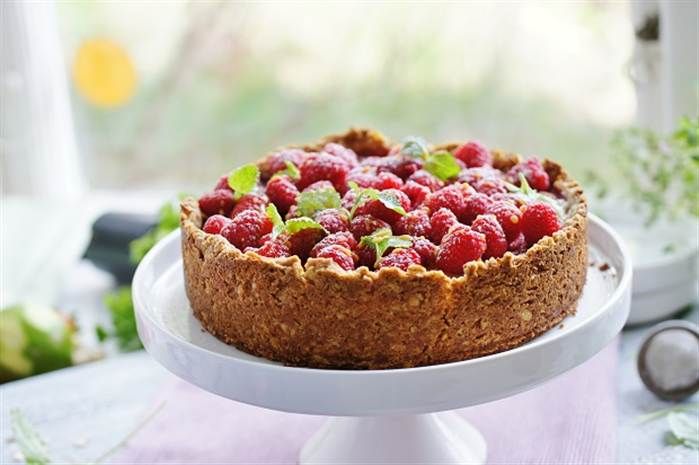 5. Mosa hallonen i en bunke. Blanda ner resten av ingredienserna till fyllningen och vispa till en jämn smet. Häll smeten i det förgräddade pajskalet och grädda sedan i nedre delen av ugnen ca 30 min, eller tills fyllningen ”stannat”. Låt cheesecaken kallna helt, gärna över natten.