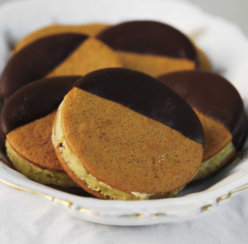 3. Bred pistaschkräm på 15 av pepparkakorna och lägg ihop med resten av kakorna. Ställ dem i kylen.