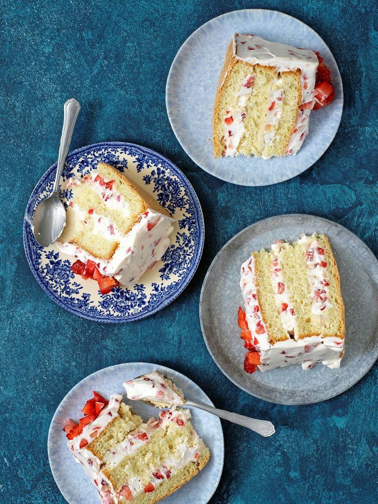 Det här är en riktig klassiker med fluffiga vaniljbottnar, färskostfrosting och färska jordgubbsbitar. En sommardröm som bara blir godare av att få stå och gotta sig i kylen över natten.
