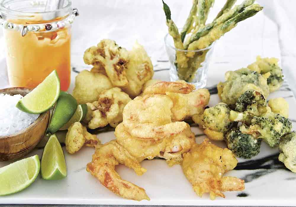 Tempurafriterade grönsaker och scampi med het majo