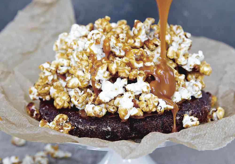 6. Garnera tryffeltårtan med alla popcorn. Det ska bli ett maffigt berg med karamelliserade popcorn uppepå. Ringla resterande kolasås över tårtan och servera tillsammans med lättvispad grädde eller vaniljglass.