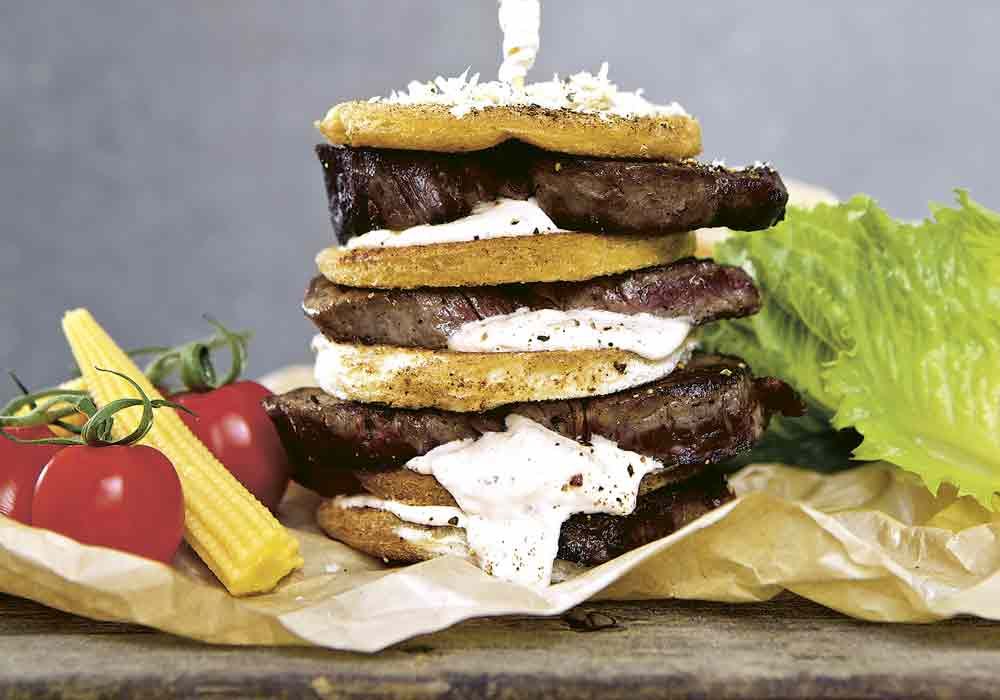 4. Varva bröd, sås, kött, sås och bröd till ett högt torn på tallriken.