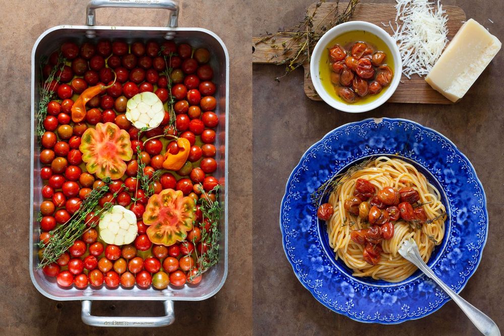 Ibland är det så enkelt. Utan att tänka särskilt mycket alls har man på tallriken framför sig en rätt som slår det mesta. Plocka riktigt mogna små tomater, släng in dem i ugnen och plötsligt har de fått en djup, söt, intensiv smak. Använder du tomater som inte fått den långa, soliga mognadstiden kan du addera lite honung till ingredienslistan.
