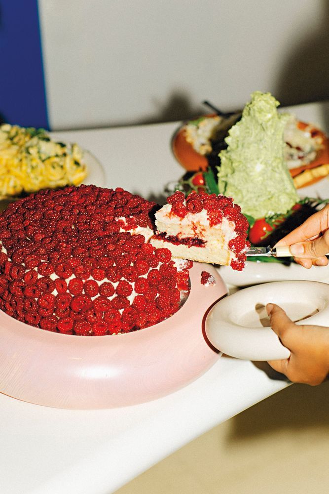 Enkel mazarintårta i två lager, täckt med vaniljfrosting. Hela tårtan kläs in med färska hallon för en vacker och extra somrig avslutning.