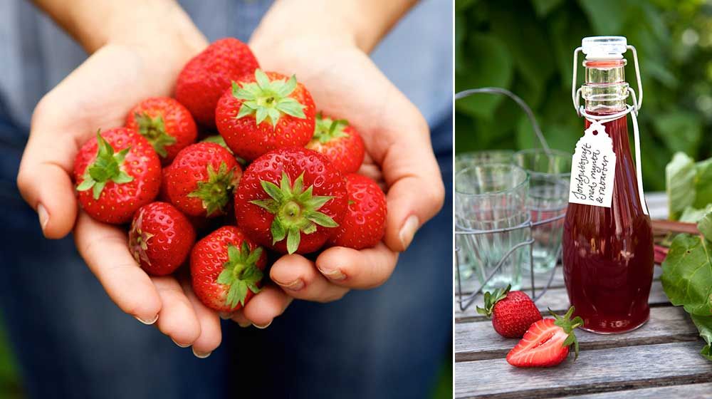 Gör härlig sommarsaft med jordgubbar och rabarber. En perfekt kombination av sött och surt. Myntan blir pricken över i.