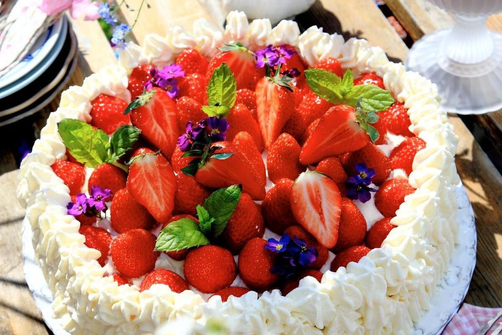 Bred vispad grädde runt tårtan. Garnera med spritsad grädde och jordgubbar.