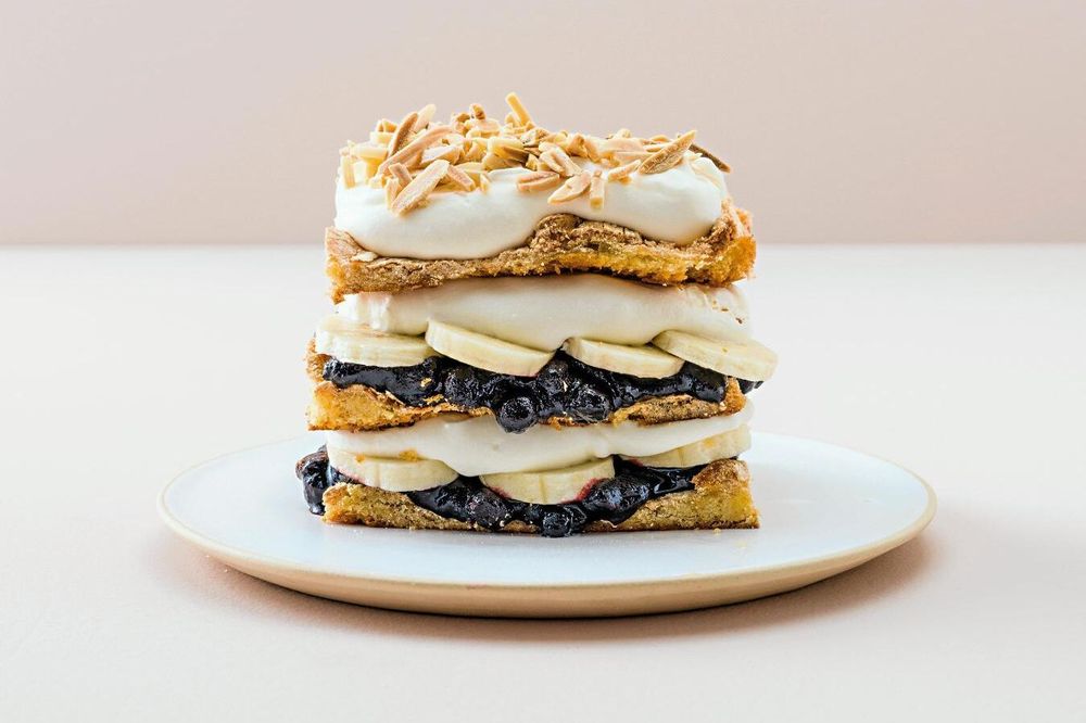 Detta är Tommy Myllymäkis favorittårta sen han var barn. Varva grädde, banan och blåbär på en lite seg, bakad sockerkaka med maräng. Jisses, så gott!