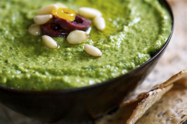 Mixa 3,5 deciliter späda groddar, 1 matsked tahini,e n vitlöksklyfta, 1 matsked citronsaft och lite spiskummin. Smaka av med salt och peppar. Ringla över lite olivolja.