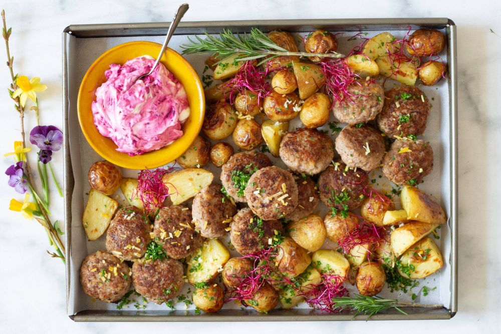 Saftiga lammfärsbiffar blir gudagott med en rödbets- och chèvreröra som sätter fart på smaklökarna. Underbar bjudrätt i påsk!