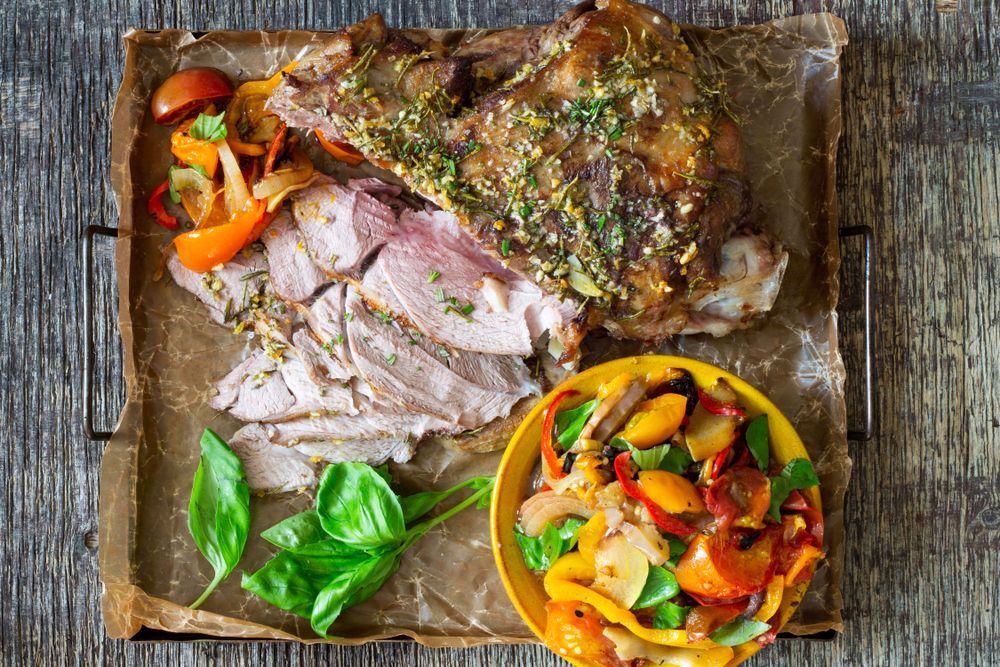Underbart mör och saftig lammstek med smak av vitlök, rosmarin och citron serveras här med en god grönsaksröra med bland annat zucchini och aubergine. En perfekt rätt till påskbordet!