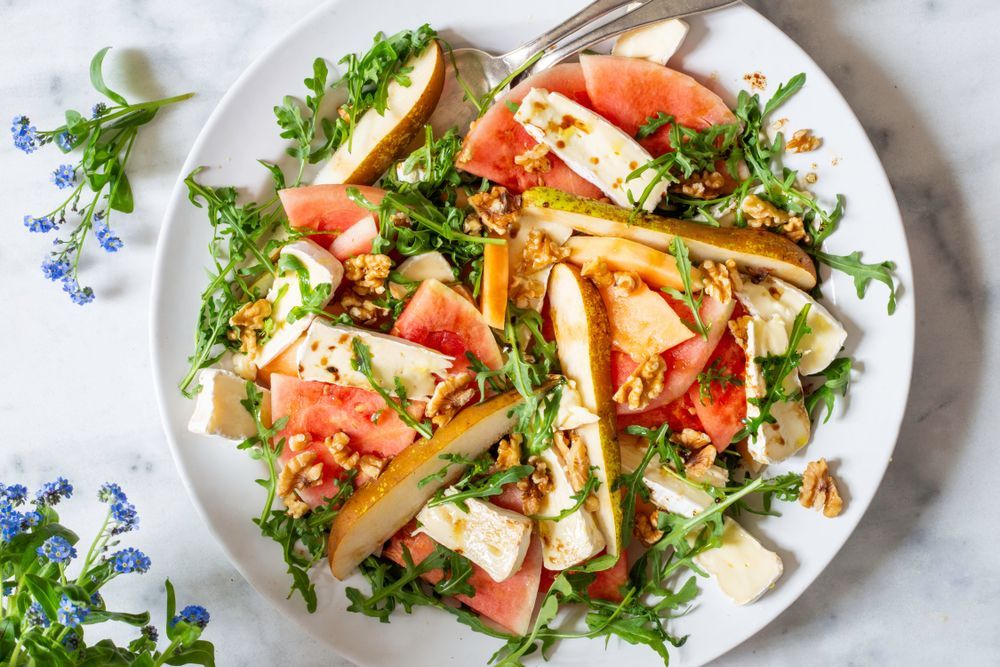 Fräsch och urgod sallad som både kompletterar och mättar. Härlig smakbrytning med päron och valnötter till melon och ost.