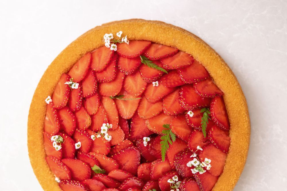 Jordgubbar är sommarens stora måste – och en jordgubbstårta på midsommar är alltid ett säkert kort. Den här lyxiga varianten har en mazarinbotten och vaniljpannacottafyllning.