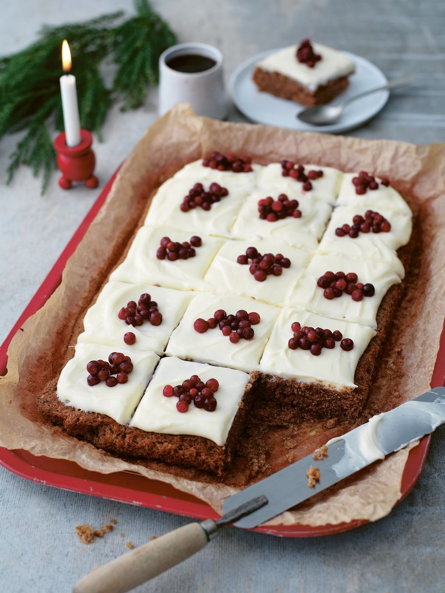 Underbar mjuk pepparkaka som du bakar i långpanna, med glasyr och lite lingon blir det extra njutbart!