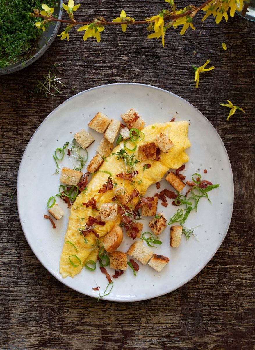 Rulla upp den ljusa, krämiga omeletten på tallriken. Strö genast över krutonger, bacon och det gröna. Ät omedelbart och under andakt.