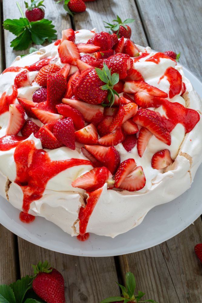 Maräng, grädde och ett berg av jordgubbar. Midsommarens godaste efterrätt är en enkel men ack så god pavlova!