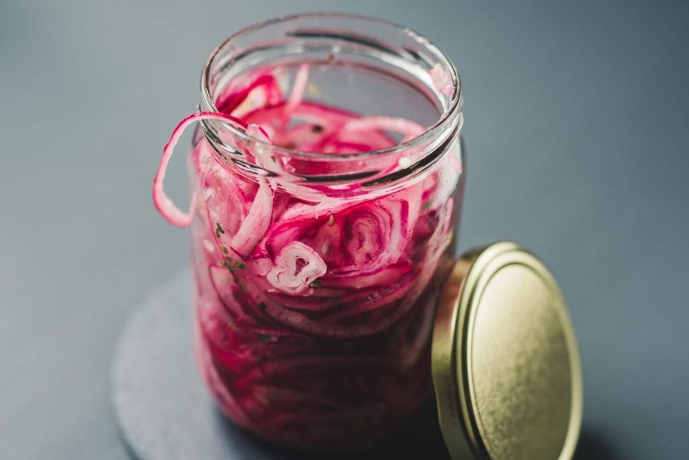 Picklad rödlök kryddad med socker, lagerblad och svartpeppar.