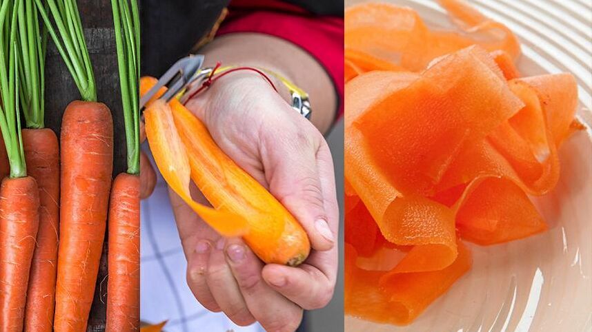 2. Skala morötterna och skär i stadiga strimlor med potatisskalare eller osthyvel.