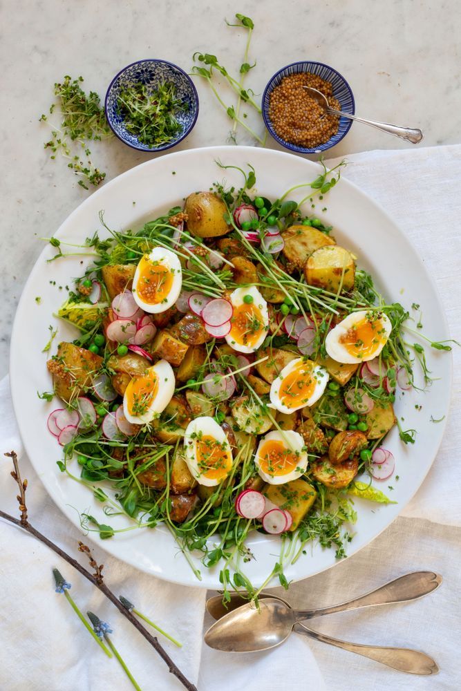 Potatis, ägg och grönt – den här potatissalladen är perfekt på buffén. Den är god som den är eller till lamm, korv eller fisk.