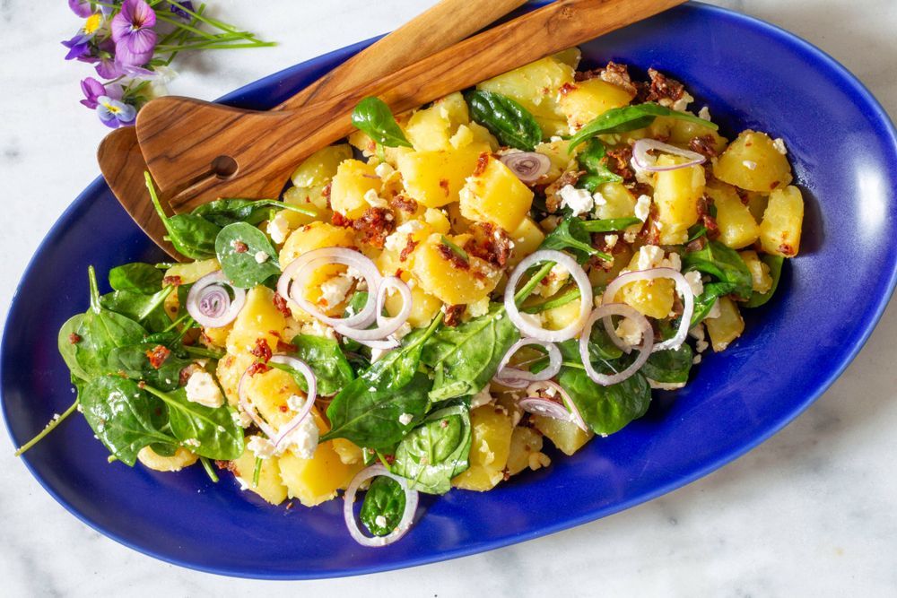 Potatissallad passar till allt och är alltid lite extra festligt. Här gör du den med soltorkad tomat och en supergod dressing.