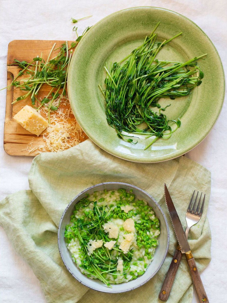 Ärtrisotto – knallgrönt för alla sinnen. Vanliga frysta ärtor och en rejäl knippa ärtskott. Grötris, smör och lagrad ost. Succé!
