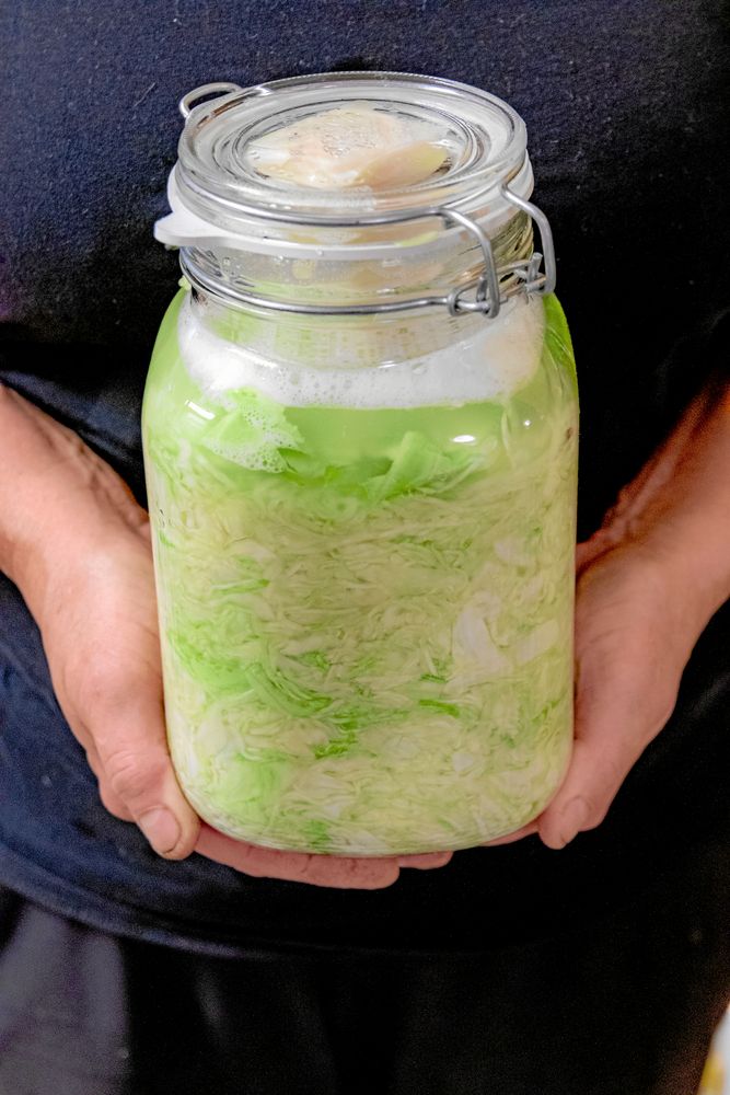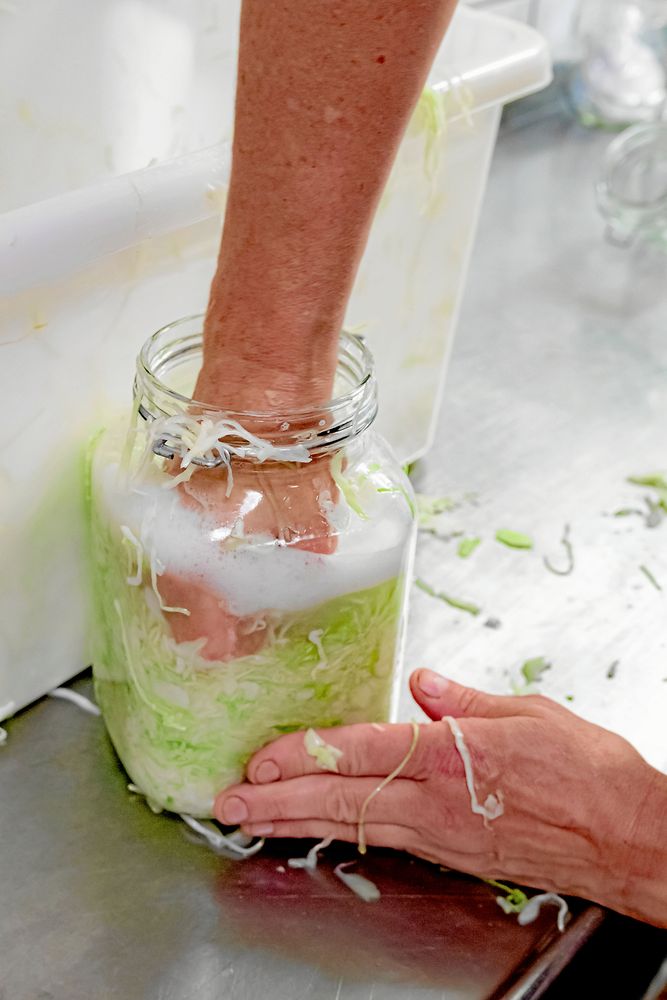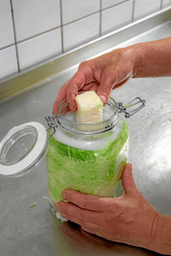 När det samlas vätska på botten av skålen så är kålen tillräckligt mjuk för att packas. Ta ett par nävar i taget och pressa den tätt och jämnt runt om i burken. Lägg på ett kålblad eller en skiva livsmedelsgodkänd plast som lock.