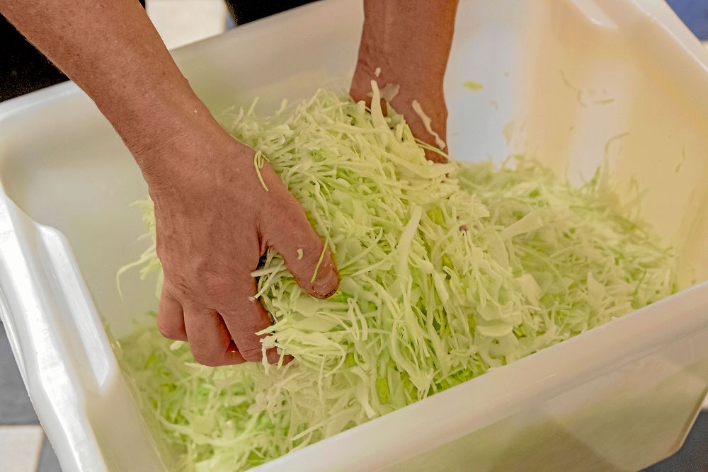 Salta, blanda runt och knåda vitkålen några gånger. Låt stå och vätska sig en stund. Knåda ett par gånger till. Ju finare du strimlar kålen desto lättare mjuknar den och släpper vätska.